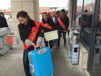35,在公司團(tuán)委的組織下,各基層團(tuán)支部積極開展。志愿者們身披綬帶深入各大站點(diǎn)、車場(chǎng),開展站臺(tái)咨詢,導(dǎo)乘服務(wù),主動(dòng)扶老攜幼,為乘客兌換零錢,共發(fā)放乘車指南1000余份,深受乘客歡迎。圖為賈汪公司志愿者在幫助江蘇安全技術(shù)職業(yè)學(xué)院開學(xué)返校的學(xué)生運(yùn)送行李。