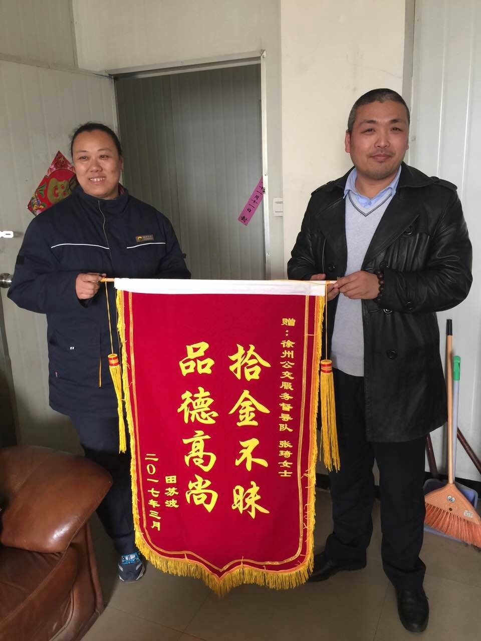 329日,正在站臺執(zhí)勤的督導(dǎo)員張琦撿到乘客掉落的公文包,經(jīng)查看發(fā)現(xiàn)包內(nèi)有蘋果筆記本一臺和一個錢包,但并沒有找到皮包主人的聯(lián)系方式。張琦把包放在了調(diào)度室等待失主來認(rèn)領(lǐng),約一小時后失主匆忙趕來尋找。失主見到失而復(fù)得的皮包非常激動,經(jīng)過詢問得知失主姓田在徐州礦業(yè)大學(xué)工作。田先生說,“電腦里存有非常重要的資料和聯(lián)系方式,丟包之后萬分焦急,真心感謝公交督導(dǎo)員?!彪S即從錢包里拿出400元錢塞給張琦作為答謝,張琦表示:“路不拾遺本就是自己的義務(wù),作為站臺督導(dǎo)員經(jīng)常會在站臺撿到乘客掉落的物品,不管東西貴重與否我們都會幫失主妥善保管等待認(rèn)領(lǐng)?!?/span>331日,田先生和他的愛人送來錦旗表示感謝!